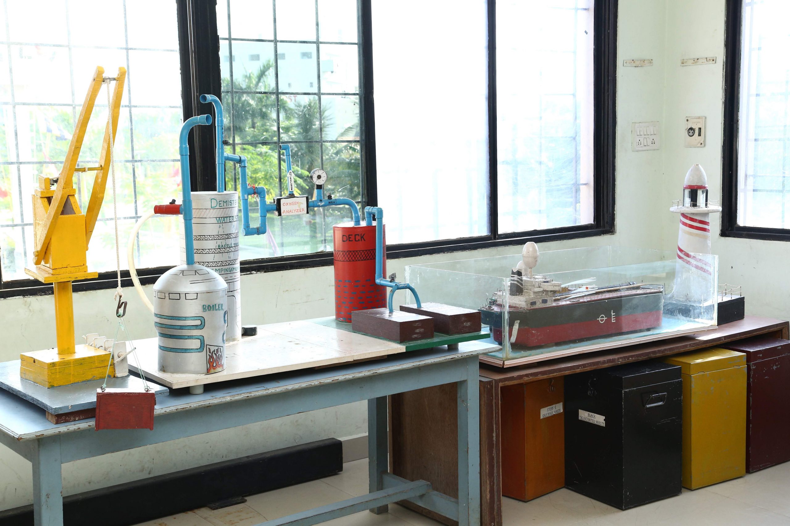 This lab is an Engineering workshop, which has been designed to give practical training to the engineering cadets. Here the students learn tasks related to engine maintenance and upkeep. They have access to tools required for practical knowledge and real life application.